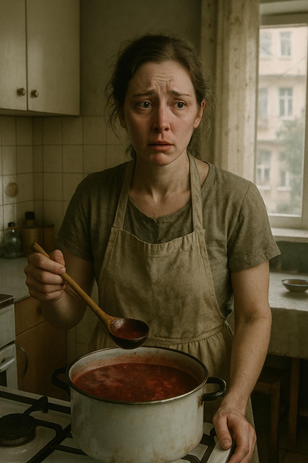 Борщ на плите тихо кипел, она только что попробовала его — не хватало соли.