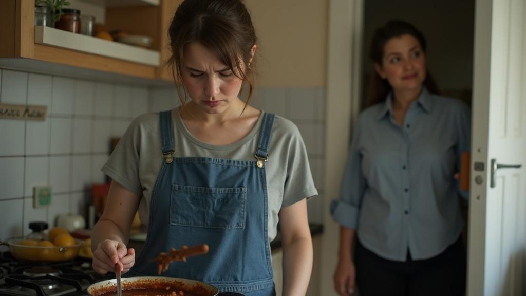 Однако вскоре стало ясно, что каждое её действие попадает под внимательный контроль свекрови. — Не так режешь яблоки, они должны быть дольками, а не кубиками. — Соль нужно класть внутрь тушки, а не только снаружи. — Температуру сделай ниже, иначе всё сгорит.