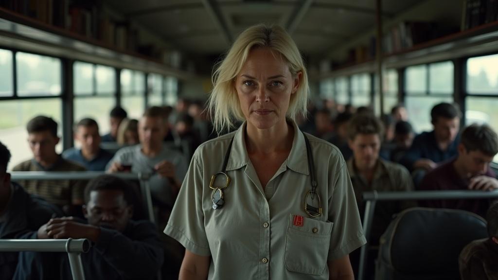 На город опускалась тьма. Последний рейс подходил к концу. В автобусе оставалось всего несколько пассажиров — уставшие рабочие, студенты, пожилая женщина с сумками.