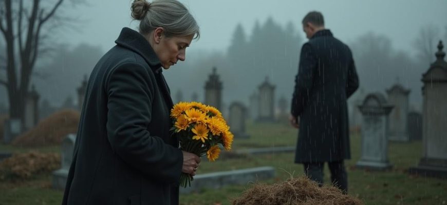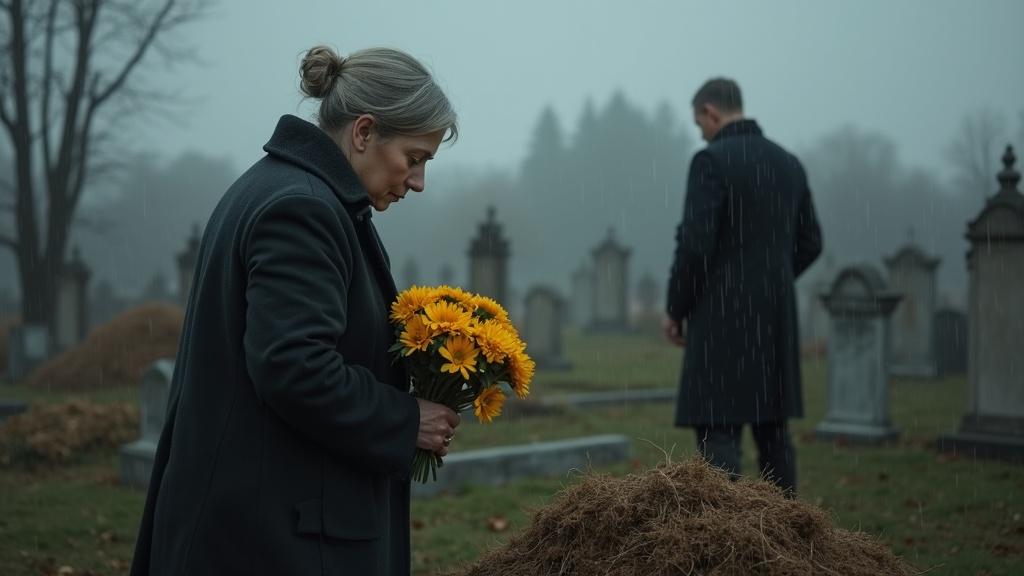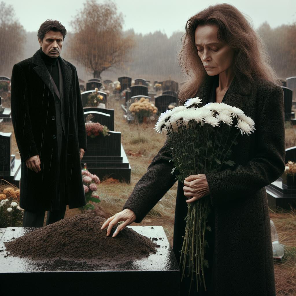 Ольга стояла у недавно обустроенной могилы с букетом хризантем, которые уже начали промокать под мелким дождём.
