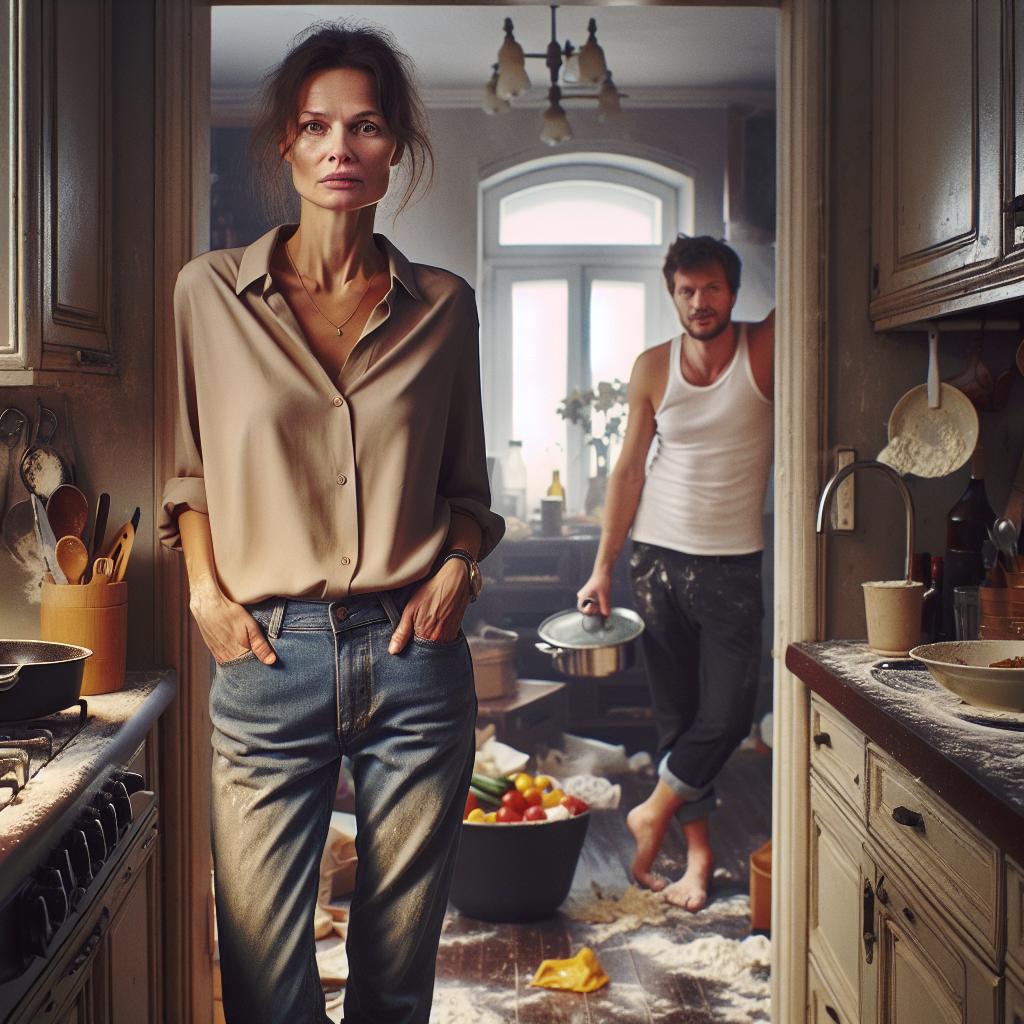 За его спиной кухня выглядела так, будто здесь только что прошла буря — мука на потолке, жирные пятна на стенах, куча грязной посуды в раковине. — Зато вкусно получилось! — с гордостью заявил муж, показывая дымящееся блюдо.