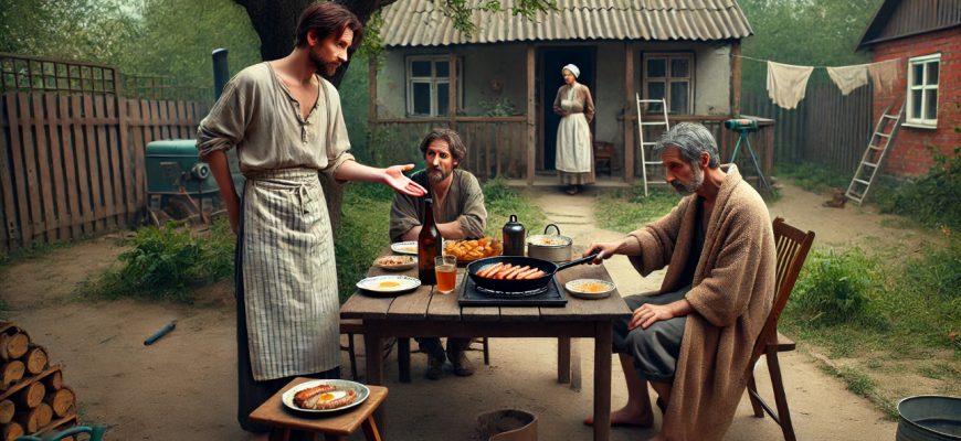Хозяин и хозяйка только-только сели, как неожиданный гость. Хозяйка в старом халате, волосы пучком.