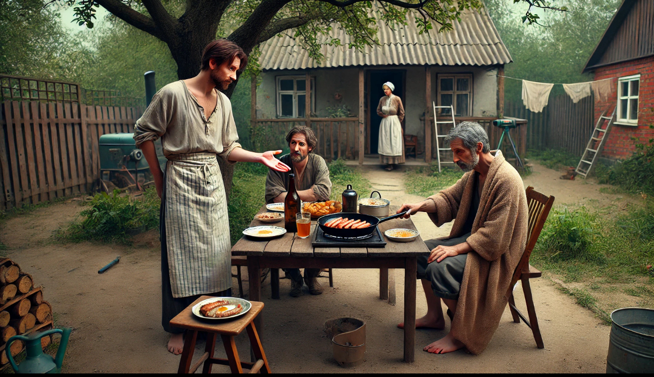 А гость подошел, руку протянул, чтобы поздороваться, пожелал приятного аппетита, а сам в сковородку заглянул с любопытством.